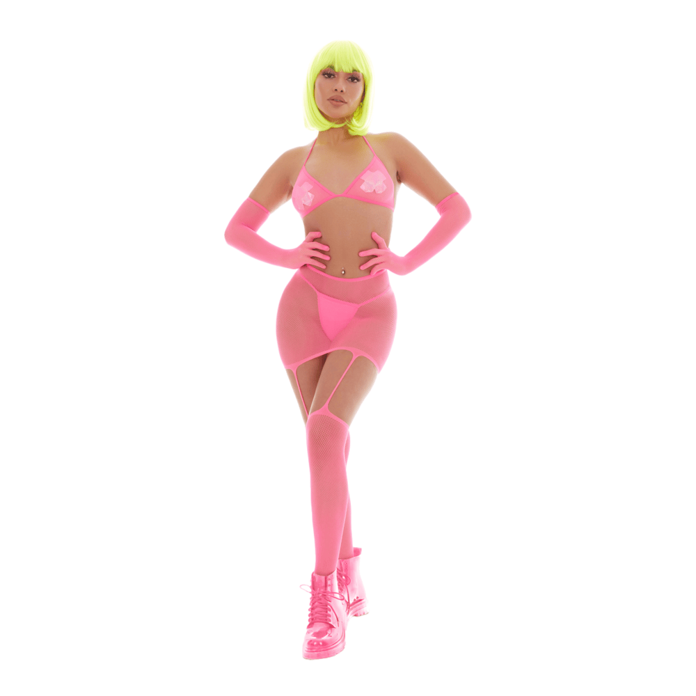 All sugar, no shame. This candy-colored strappy dancewear set is sweet in the front and scandalous in the back. The triangle top features contrast piping and heart-shaped accents, while the ultra-mini shorts bring the bounce. Finished with cheeky cut-outs and a rave-ready attitude. Add candy bracelets and let the night begin.